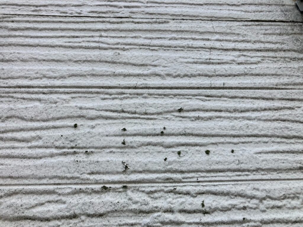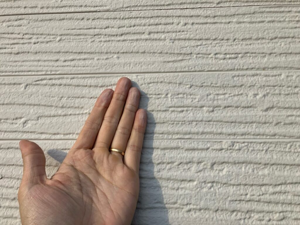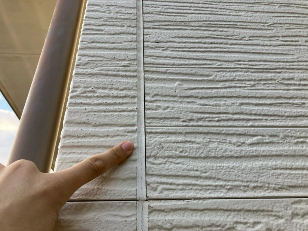 基材を防水する機能が失われており、雨水が直接侵入しやすい状態です。基材が水分を含んで乾くという状態を繰り返すと、基材の反り、剥離、建物内部への漏水に繋がる為、塗り替えによって保護する事を当社ではおすすめさせていただいております。