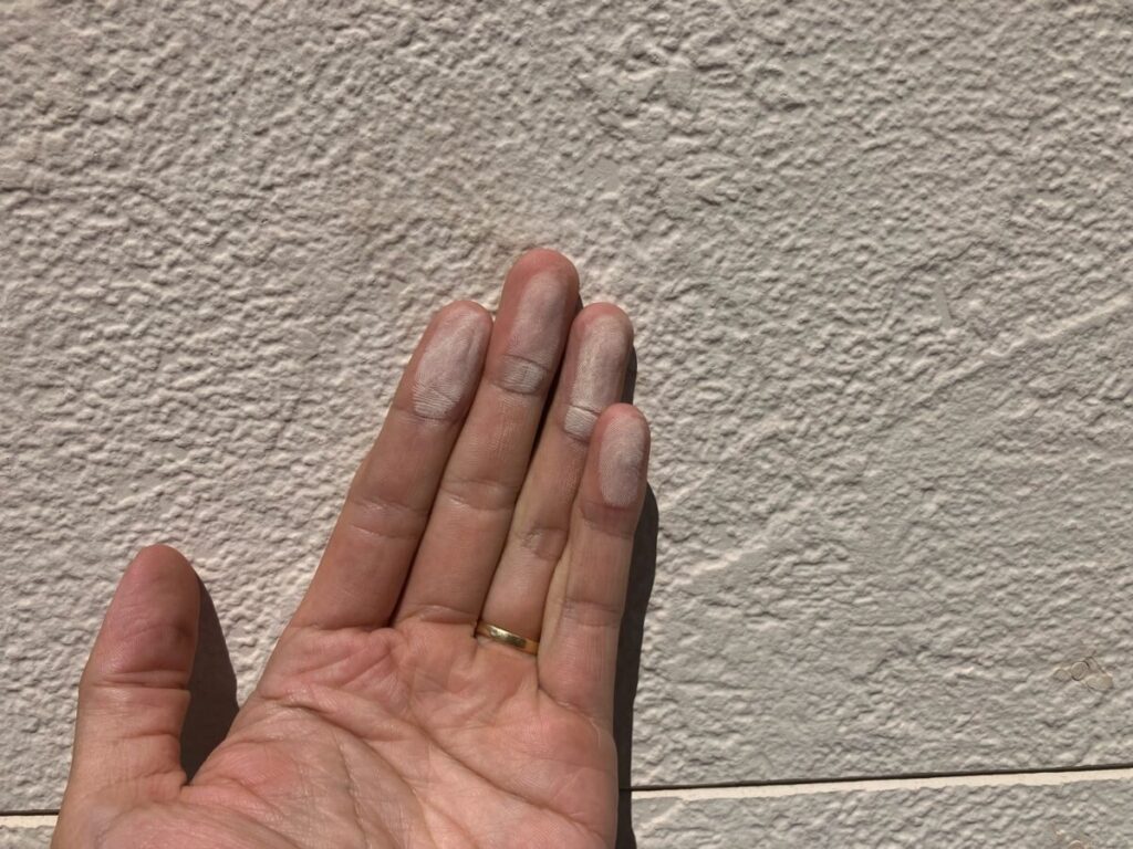 基材を防水する機能が失われており、雨水が直接侵入しやすい状態です。基材が水分を含んで乾くという状態を繰り返すと、基材の反り、剥離、建物内部への漏水に繋がる為、塗り替えによって保護する事を当社ではおすすめさせていただいております。