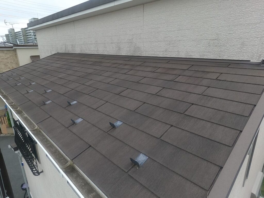 雨漏りもなく、下地もそこまで傷んではなかったので今回は貫板交換後遮熱塗料にて屋根塗装工事をご提案させて頂きました。