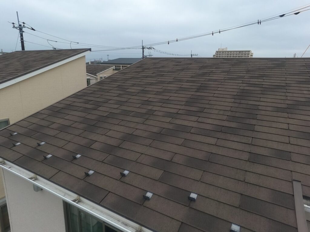 H様邸は築年数も経っておりスレート屋根という事もあり全体的に苔や変色・退色が見られました。