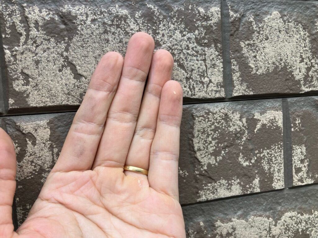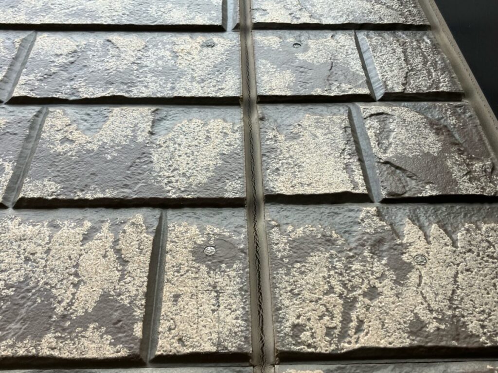 基材を防水する機能が失われており、雨水が直接侵入しやすい状態です。基材が水分を含んで乾くという状態を繰り返すと、基材の反り、剥離、建物内部への漏水に繋がる為、塗り替えによって保護する事を当社ではおすすめさせていただいております。