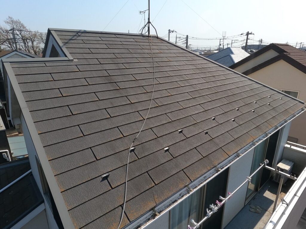 雨漏りもなく、下地もそこまで傷んではなかったので今回は遮熱塗料にて屋根塗装工事をご提案させて頂きました。