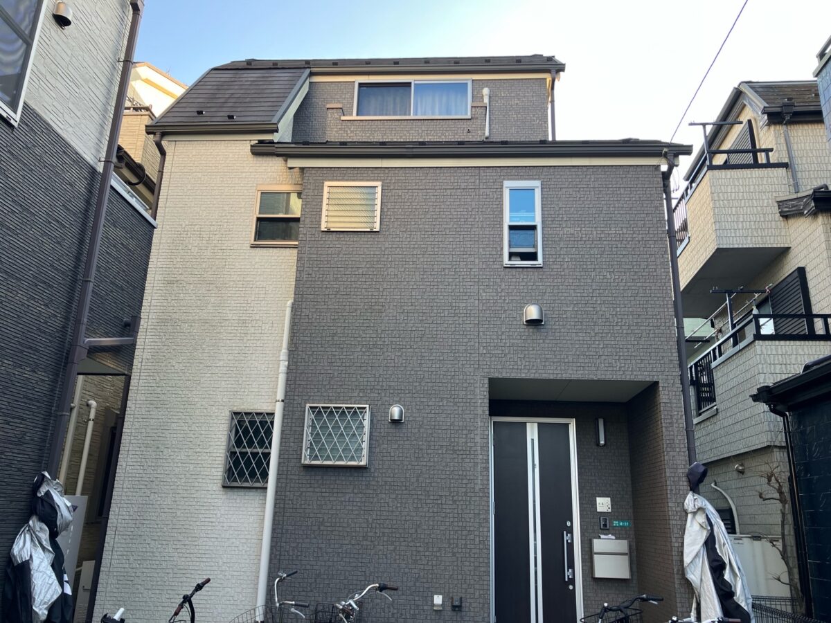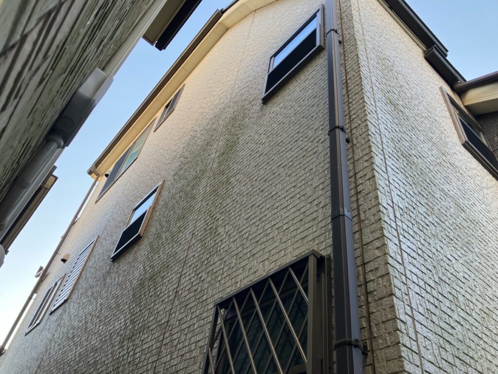 外壁には苔や黒ずみ・シーリングの割れが見られました。