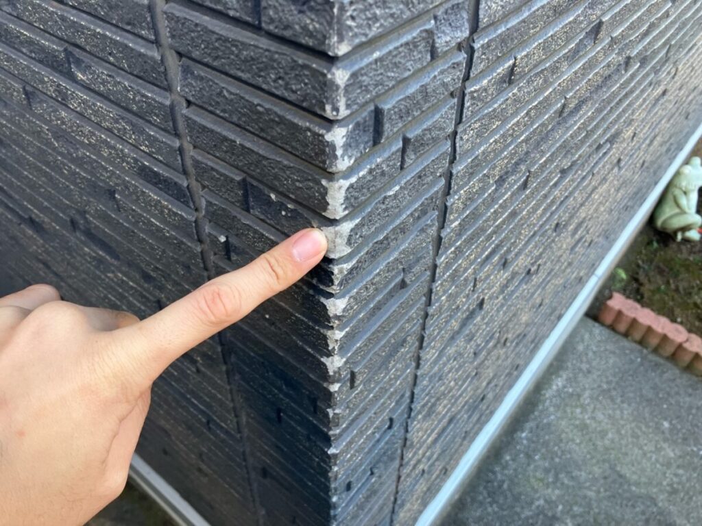 基材を防水する機能が失われており、雨水が直接侵入しやすい状態です。基材が水分を含んで乾くという状態を繰り返すと、基材の反り、剥離、建物内部への漏水に繋がる為、塗り替えによって保護する事を当社ではおすすめさせていただいております。